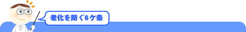 人間、年をとればお肌にシワができることはいたし方ないことです。ただ、これを努力によって、遅らせたり、シワを最小限におさえたりすることは可能なのです。来月からのトピックスで、本格的にスキンケアだけでなく、身体の内面からもこの老化を遅らせる方法を伝授します。最後に、老化を防ぐ6か条をもう1度書いておきます。 |