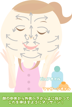 ピュアオイルやマッサージオイルをつかって、顔の中心から外側へ、下から上に向かってシワの方向と直角に(しわを伸ばすように)手を動かすことが基本です。