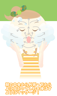 ピュアオイルやマッサージオイルをつかって、顔の中心から外側へ、下から上に向かってシワの方向と直角に(しわを伸ばすように)手を動かすことが基本です。