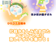 | こうすることで、熱によって血流が上がり、新陳代謝を促しつつ、化粧水のパック効果も上がりますから、冬場の乾燥肌対策にはぴったりなのです。おまけに、熱によって毛穴が広がり皮脂分泌もあがりますから、毛穴の奥の固まったコメドをおしだし、毛穴もきれいにすることもできますので、一石二鳥です。