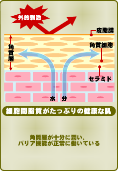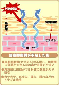 この状態では基礎化粧品で外からどんなに水分や油分を補っても、お肌は潤いません。まずは、細胞間脂質を増やして水分を逃がさないことが先決になります。