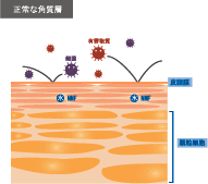 | ? 化学物質や細菌からの防御 角質層を構成しているタンパク質(ケラチン)は硬くて非常に強い性質を持っています。 また、皮膚表面の皮脂膜が弱酸性に保たれているために、角質層は細菌の侵入や繁殖を防ぐことができます。 ? 物質の体内浸透への防御 角質層は物質透過を阻止する層として働いています。このため、外部から簡単には皮膚吸収しないしくみになっています。したがって、お風呂に入っても決してお風呂の水が体内に侵入して、水ぶくれになる事はありません。また、外界からの物質や水の侵入を防ぐと同時に体内の水分やタンパク質などが外へ出て行かないように防ぐという性質を持っていて、皮膚内の環境を保つために重要な役割を果たしています。 ? 紫外線からの防御 主に紫外線を防ぐ役割をしているのは基底層のメラニン細胞・色素ですが、角質層も皮膚表面での反射、角質層での散乱で紫外線の防御を助けています。 また、メラ二ン色素が増加することで角質層自体も厚くなり紫外線の透過を防ぐようになります。日焼けした皮膚が厚くなって、肌の透明感がなくなり、クスミが出るのはこの反応のためです。 |