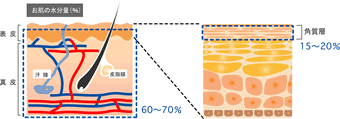 肌の滑らかさは、角質層の水分量に深く関係があります。 状態の良い普通肌の場合、角質層の水分量は15%〜20%といわれています。角質層より内部の表皮や真皮では60%〜70%になります。 |