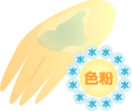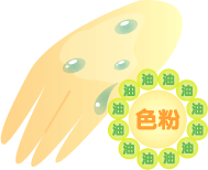 油性タイプのものは簡単に言うと色素顔料を油性成分が囲っているような構造になっています。手の甲を水で流したときに、水と油は相性が悪いですから、水をはじいて簡単には洗い落とせないのです。このタイプのファンデーションは